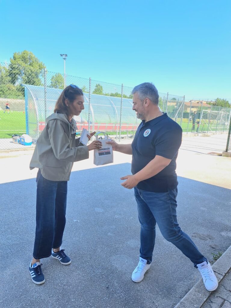 Nella sua presenza allo stadio, nel suo sguardo attento e partecipe, si è colta una familiarità autentica. Ha indossato con un sorriso la sciarpa ufficiale del Campobasso FC, nuova di produzione che ha voluto consegnarle il direttore generale Mario Colalillo. L’ha annusata, come si fa con i ricordi che sanno di casa, e stretta tra le mani, come si fa con ciò che appartiene.